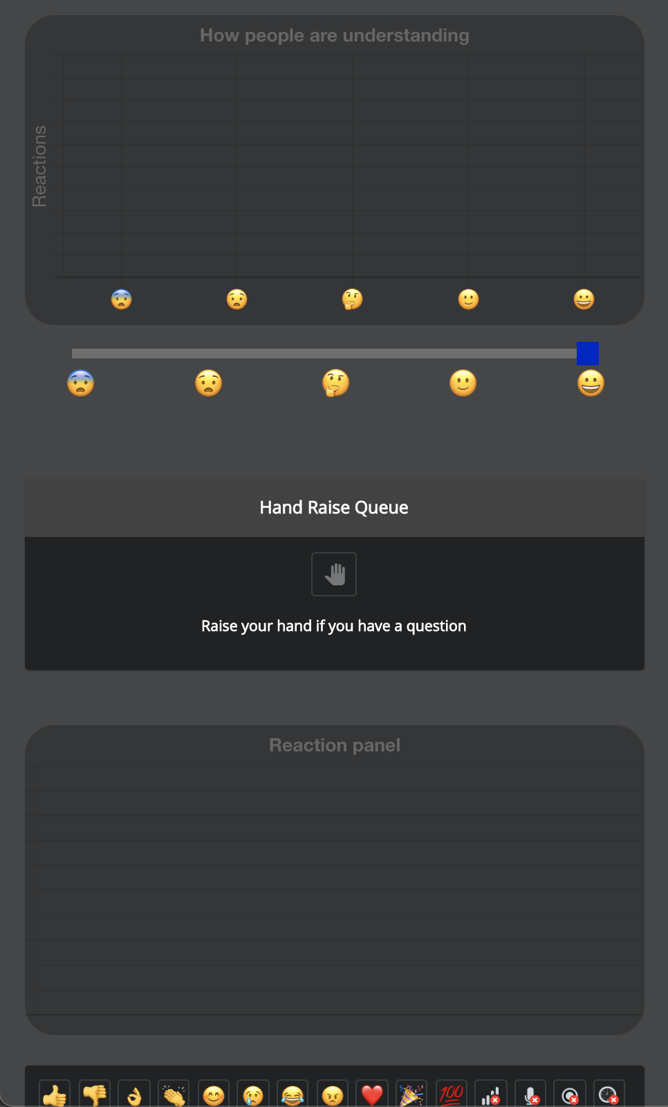 Another issue raised by our reviewers is the cognitive load of our application as there are two graphs that fluctuate as participants add their reactions and level of understanding. In order to remediate to this problem, we chose to make each section collapsible by clicking the toggle at the top right. This way, users only need to open the panels that interest them. If a user feels overwhelmed by the information displayed or feels distracted, they can minimize the given sections. This modification ensures we meet our efficiency usability goal as well as Nielsen’s heuristics “User control and freedom” and “Aesthetic and minimalist design”.