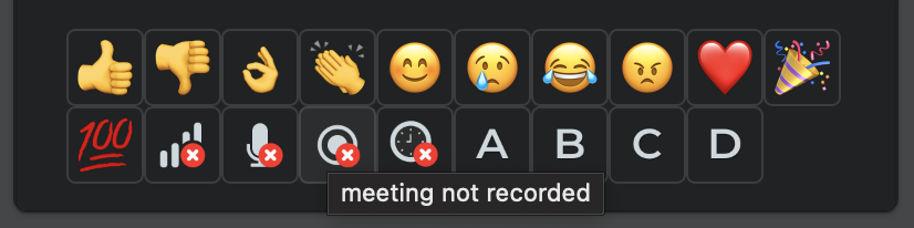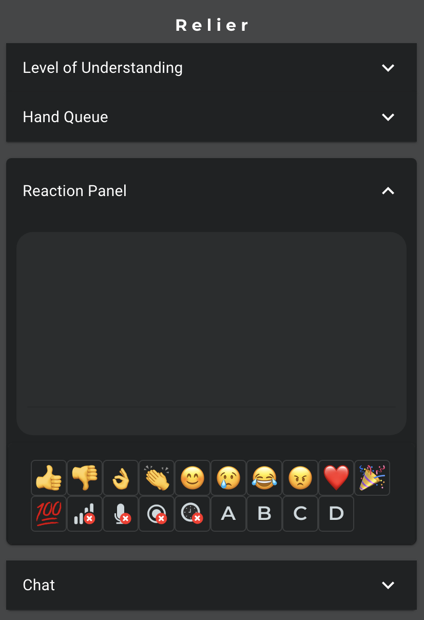 From the peer evaluation, one reviewer was still a bit confused with what each icon represented. We therefore decided that it would be more accessible and insightful for the users if we added signifiers in the form of alt text and tooltips for each of the reactions. This way, we support screen readers and participants are able to react with the icons which convey their message. This modification guarantees Nielsen’s heuristics “Recognition rather than recall” and “Help and documentation”.